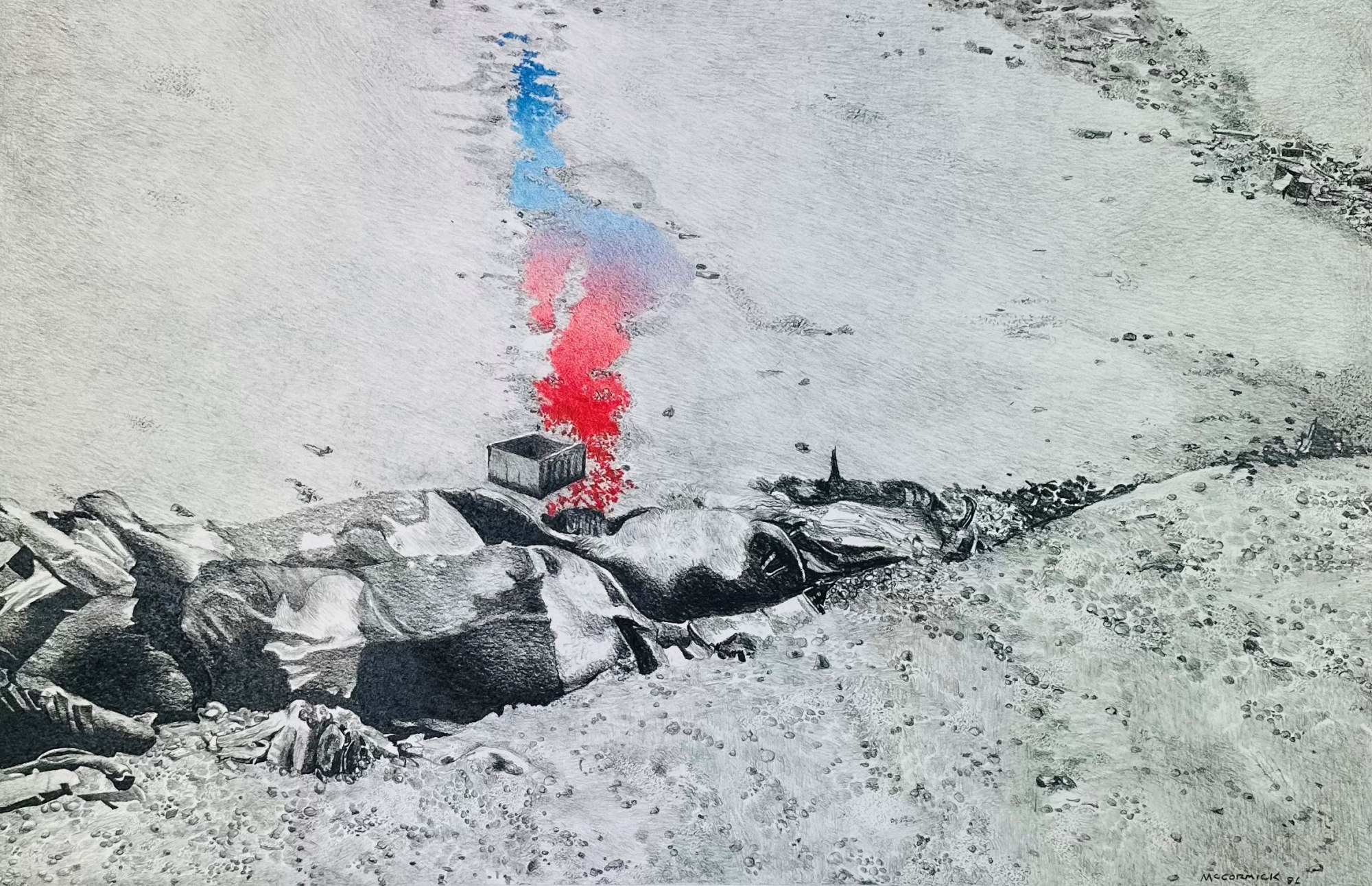 Item description: A piece that's mostly black and white, but has a little bit of red fading into blue, depicting a soul leaving somebody's body.