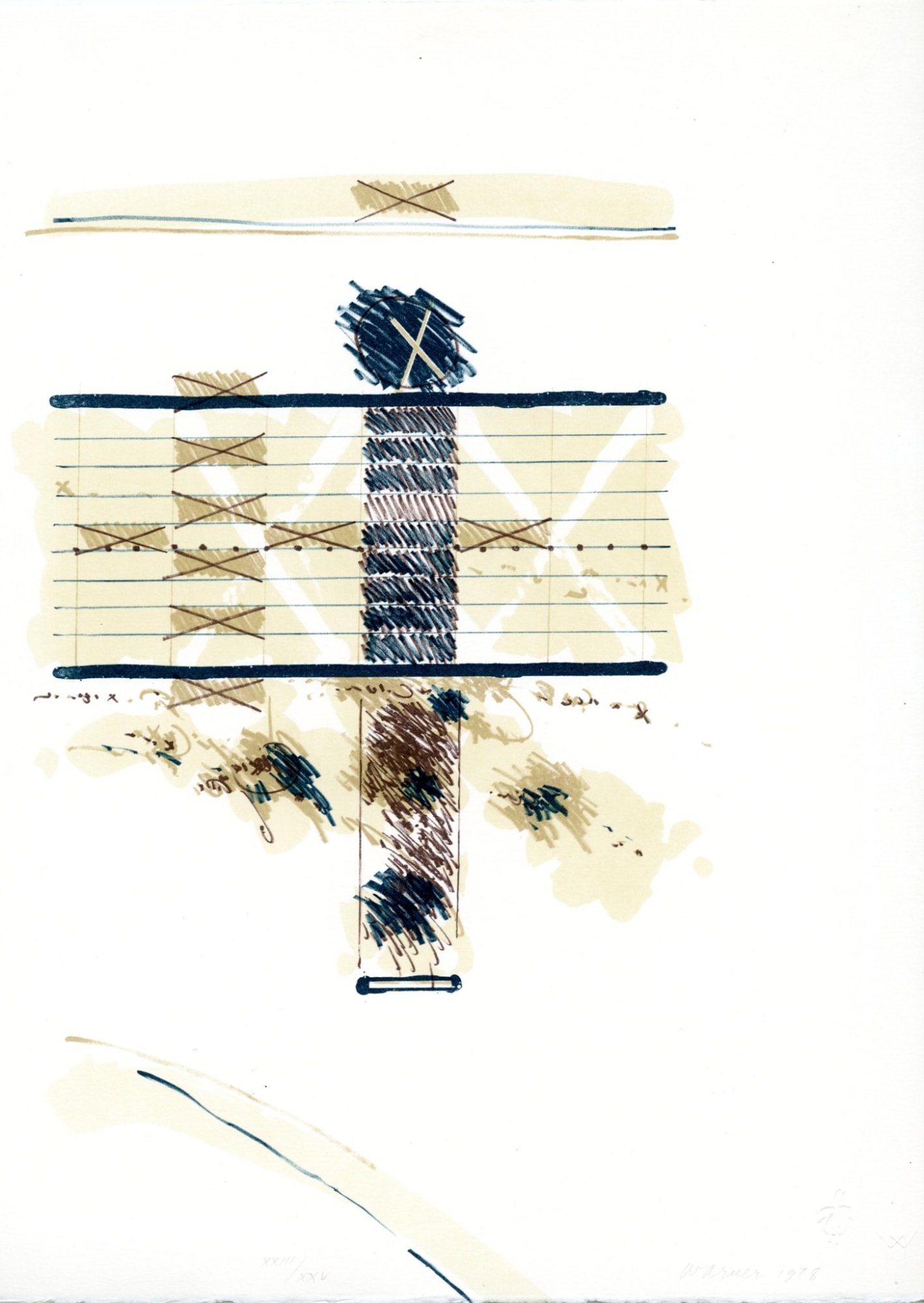 Item description: 6 x 9 grid of yellow and green. Crossed out with green, brown and tan. X's all over in brown and tan.