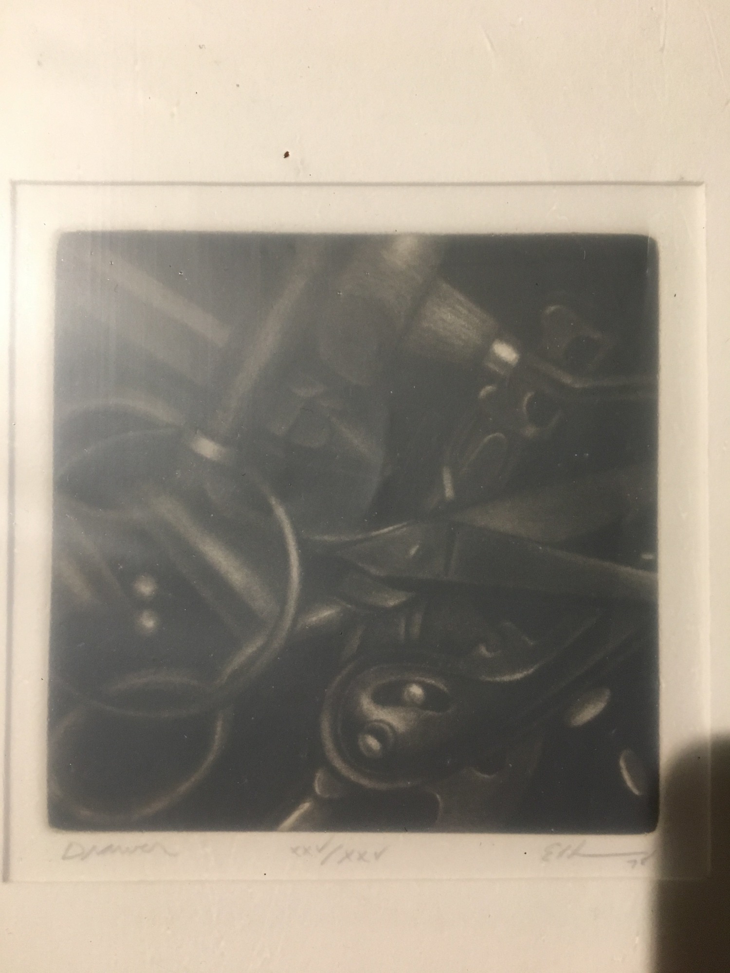 Item description: Mezzotint still life of desk drawer interior.