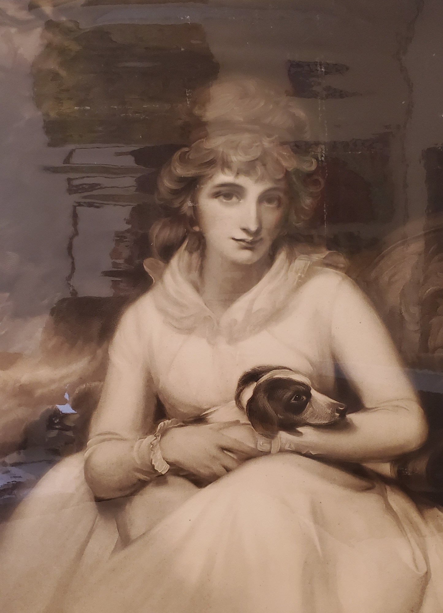 Item description: Portrait of a young woman, sitting forward in her chair, holding black and white puppy in her lap, looking towards the viewer, turned three-quarter to left, hazy trees in the background; after painter George Romney (1734-1802).
