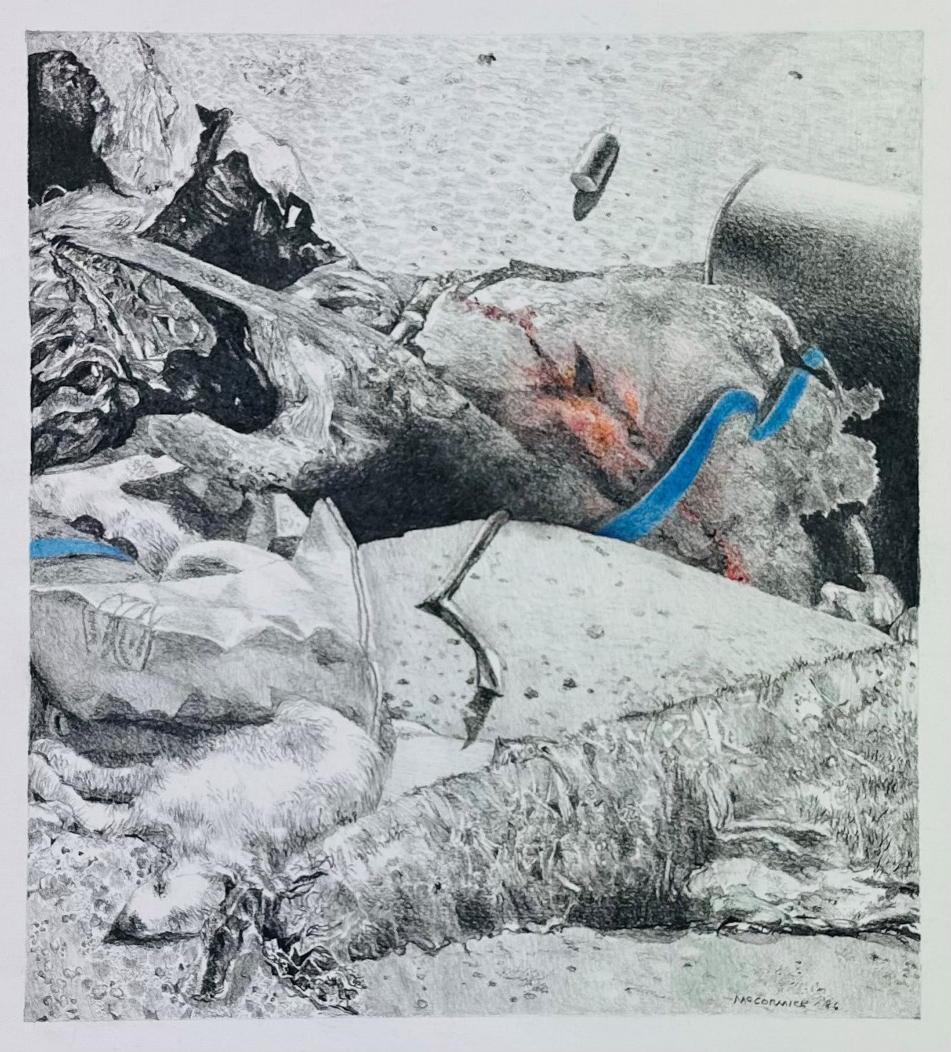 Item description: An abstract piece that's mostly black and white, but has small amounts of orange and blue.