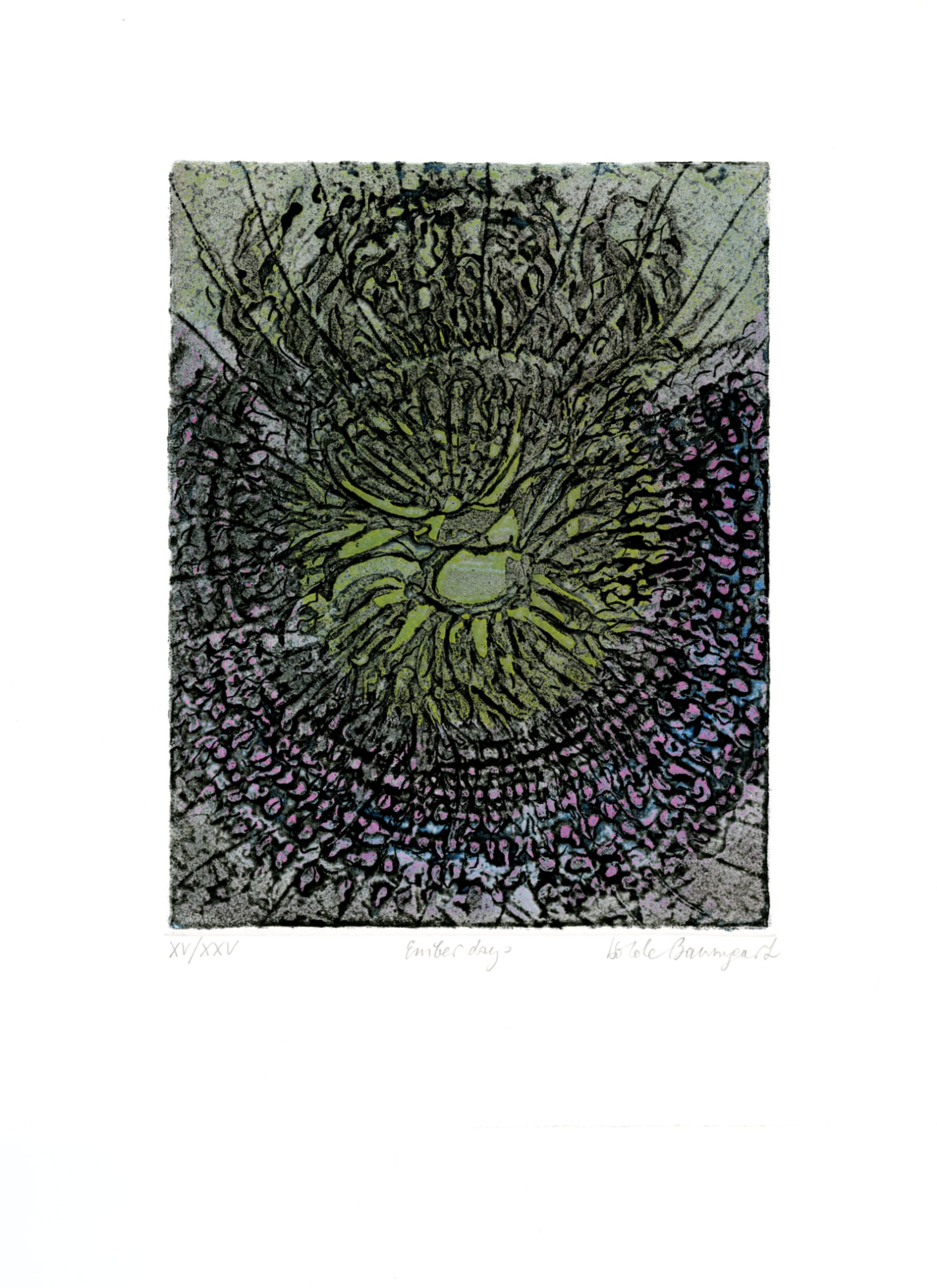 Item description: Circular abstract etching in gray, black, green, pink and blue.