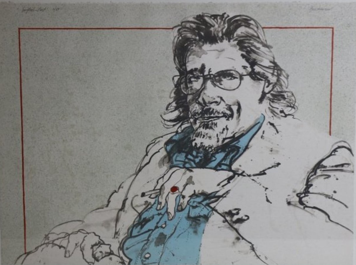 Item description: Sketched portrait of seated, smoking man. Longer hair, mustache and goatee, wearing a blue shirt, looking directly at the viewer.
