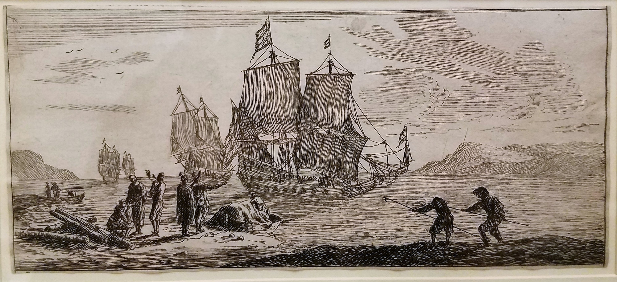 Item description: 17th century print of four sailing vessels in a bay with a number of workers on shore.