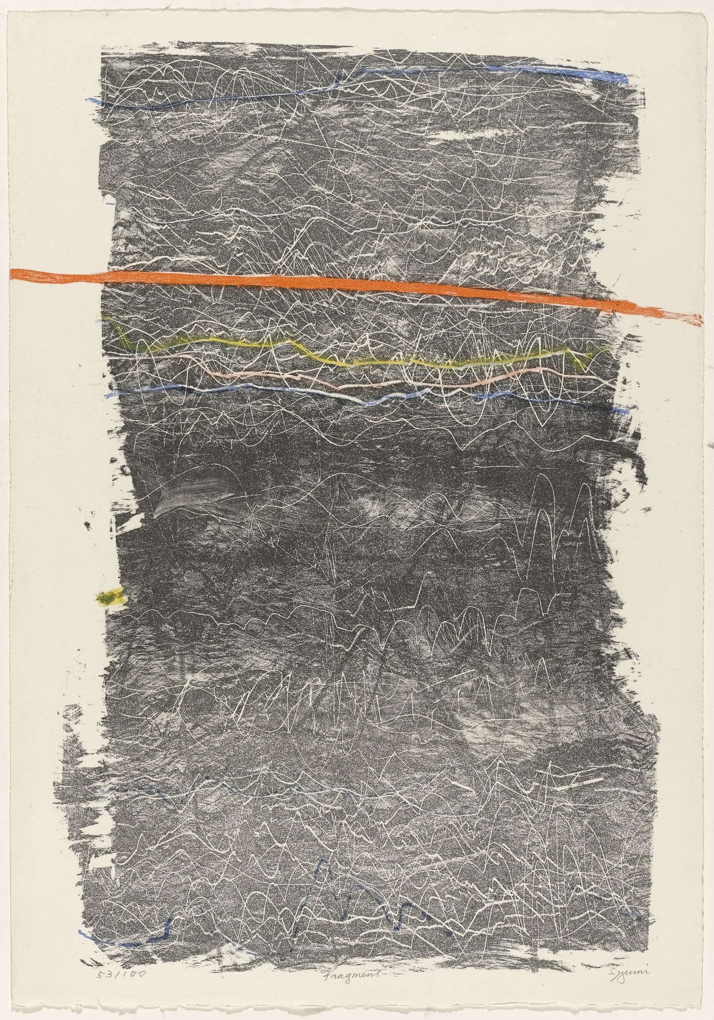 Item description: Hues of black and grey, with white horizontal squiggles throughout. Stripe of orange in upper register, with a yellow squiggle below, followed by a blue squiggle.