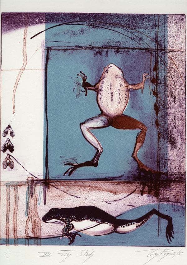 Item description: Frog lying on back, outlined in purple. Blue background. Side view of frog on stomach at bottom in purple. Hues of red, blue and purple.
