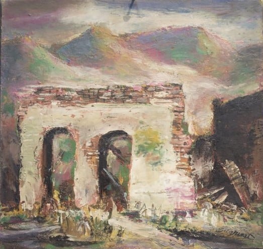 Item description: Broken, white brick wall with arches, and mountains in the background.