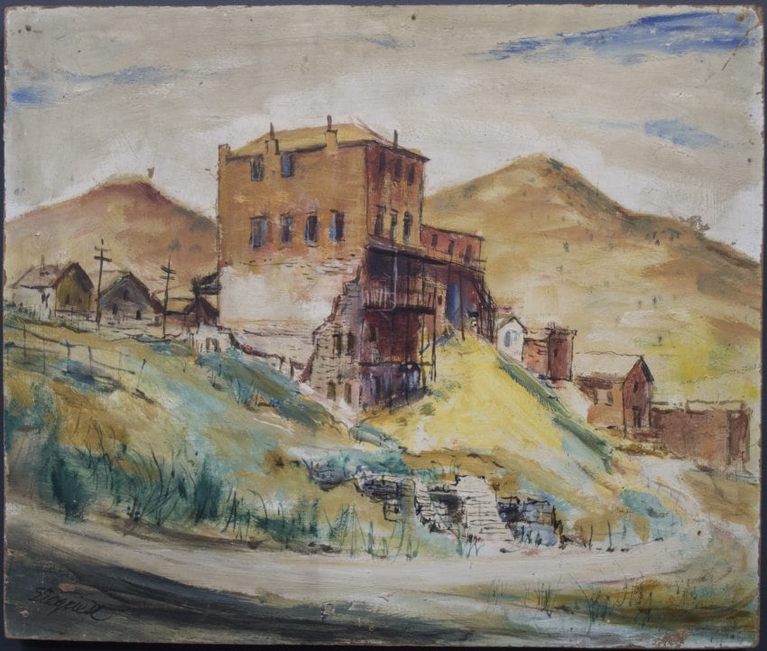 Item description: Detailed, colored landscape with decrepit building atop a hill and a road around the bottom in the foreground leading to more buildings in the back.