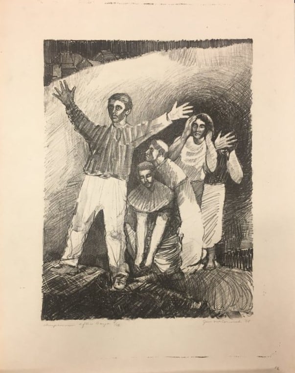 Five people, three standing and two kneeling. The man in front has his arms out and he and the woman look scared. Black and white.