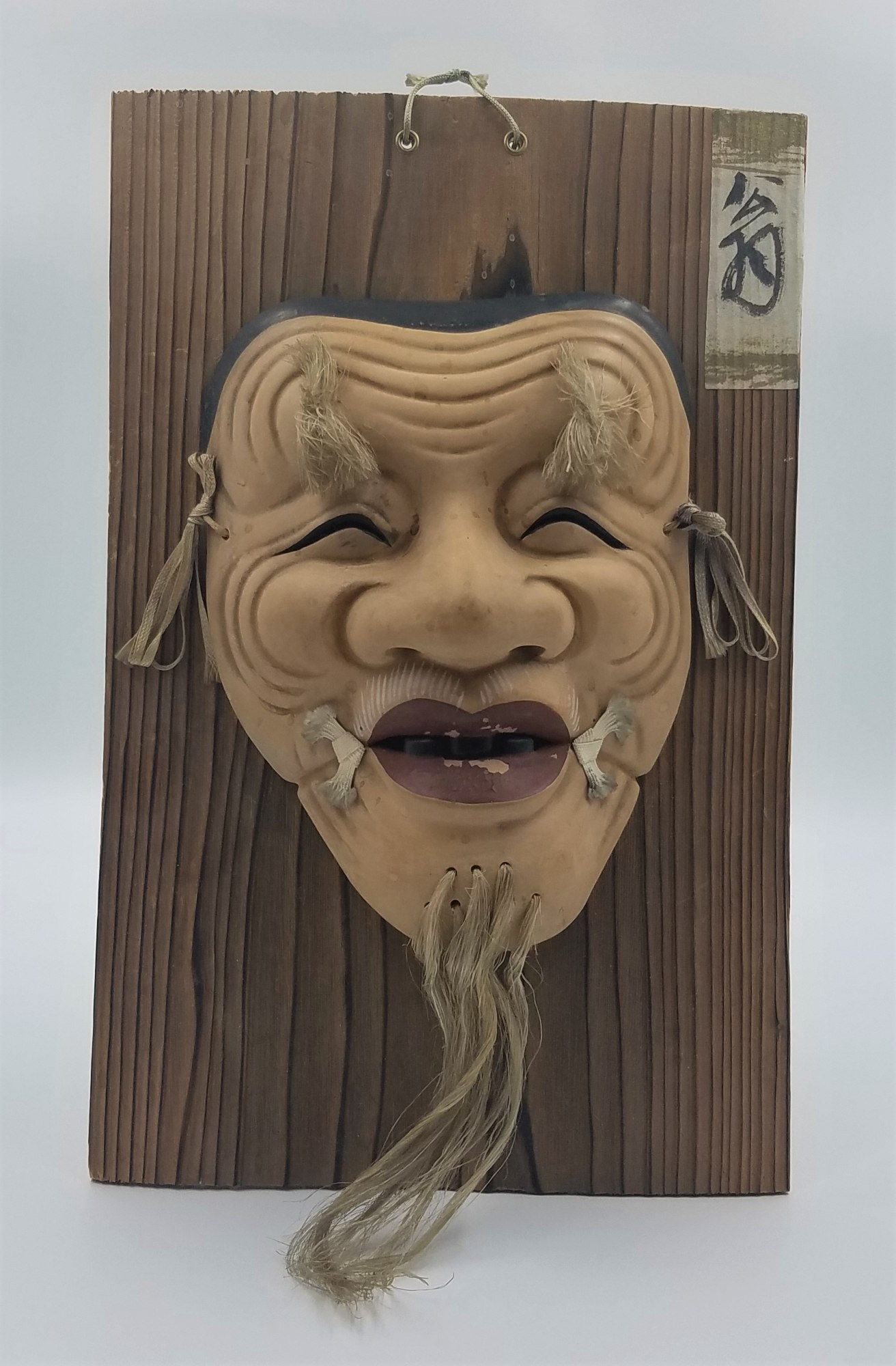 The lower jaw separated from and hinged to the face is a distinguishing character of the type of Okina. Hakushiki-jō was born before Noh in its original forms of sarugaku or dengaku, and used in prayers and celebrations. It has a soft smile of the deity symbolizing the country and the world at peace, bountiful harvests, long lives, and prosperity of the current and the future generations.