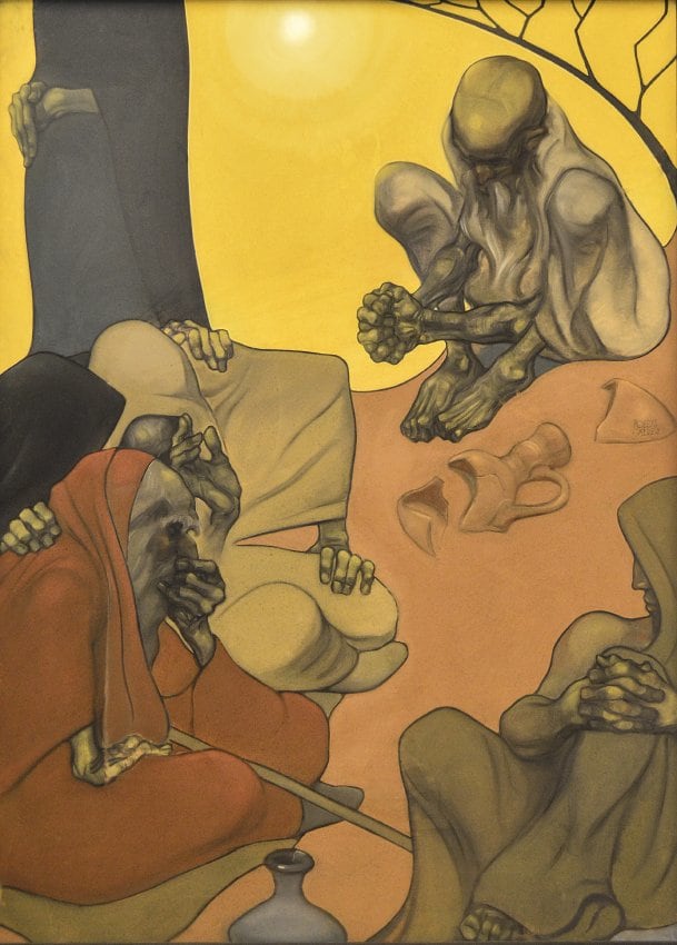 Item description: People sitting next to one another, with a broken vessel and yellow background.