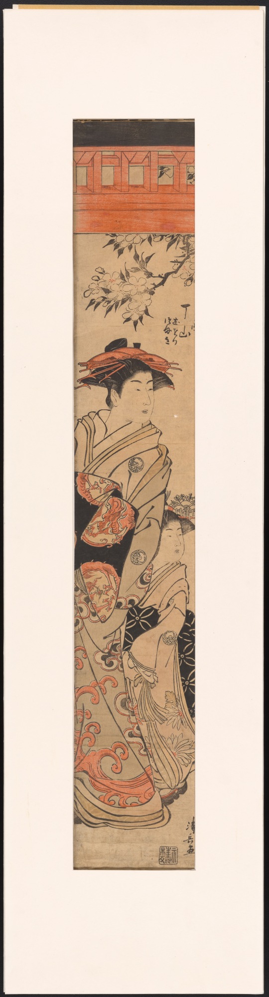 Item description: Woman with shorter attendant behind her. Print is faded red (now orange) and black.