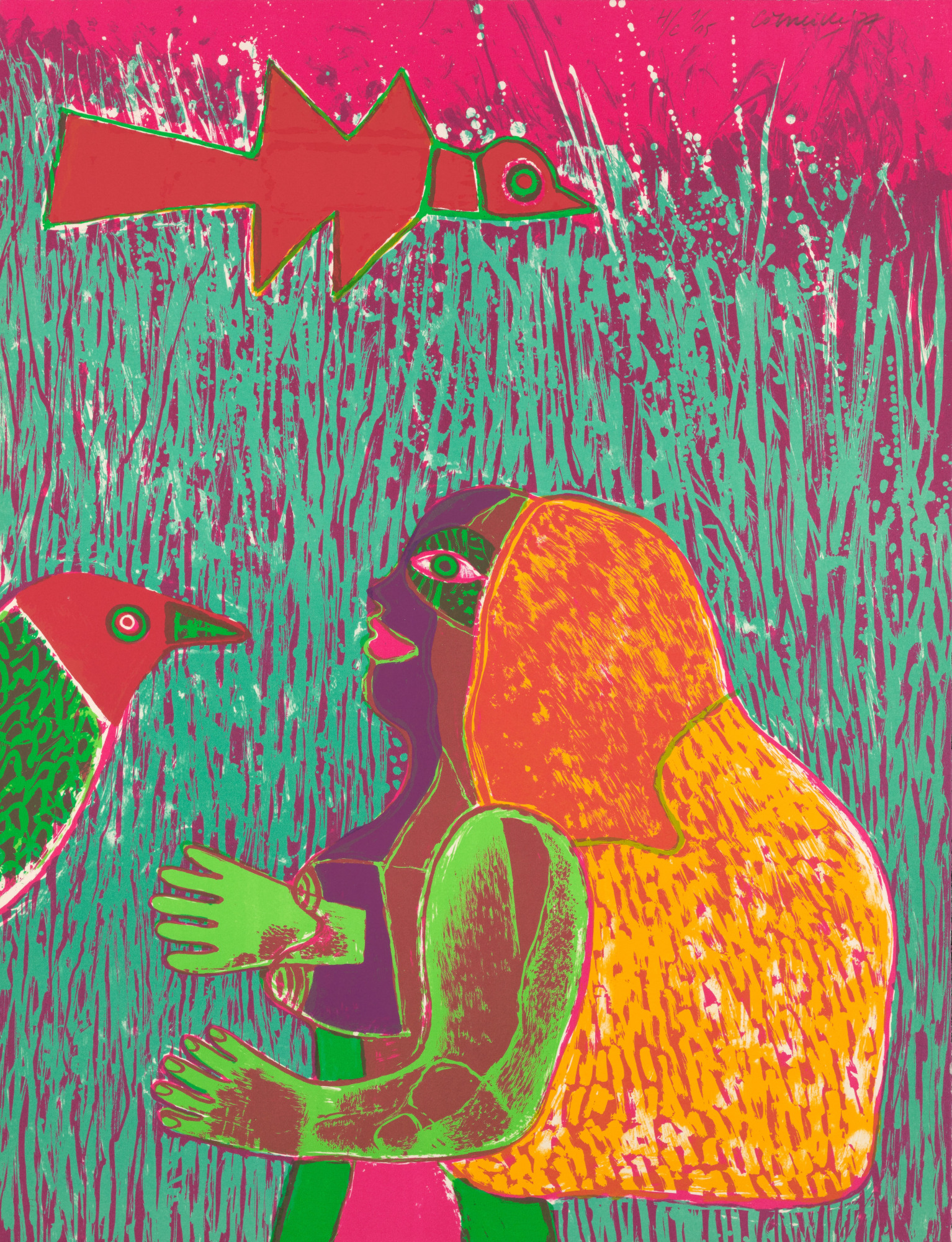 Item description: Le grand champ d'herbe, lieu électif pour un dialogue de la femme avec les oiseaux, from Enchantement de l'Été. Colorful print of a woman with two birds.