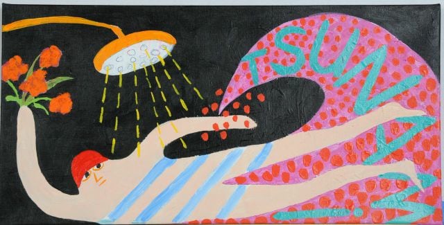 Item Description: Pink tidal wave with "Tsunami" written inside of it, a figure swimming under a shower head while holding red flowers.