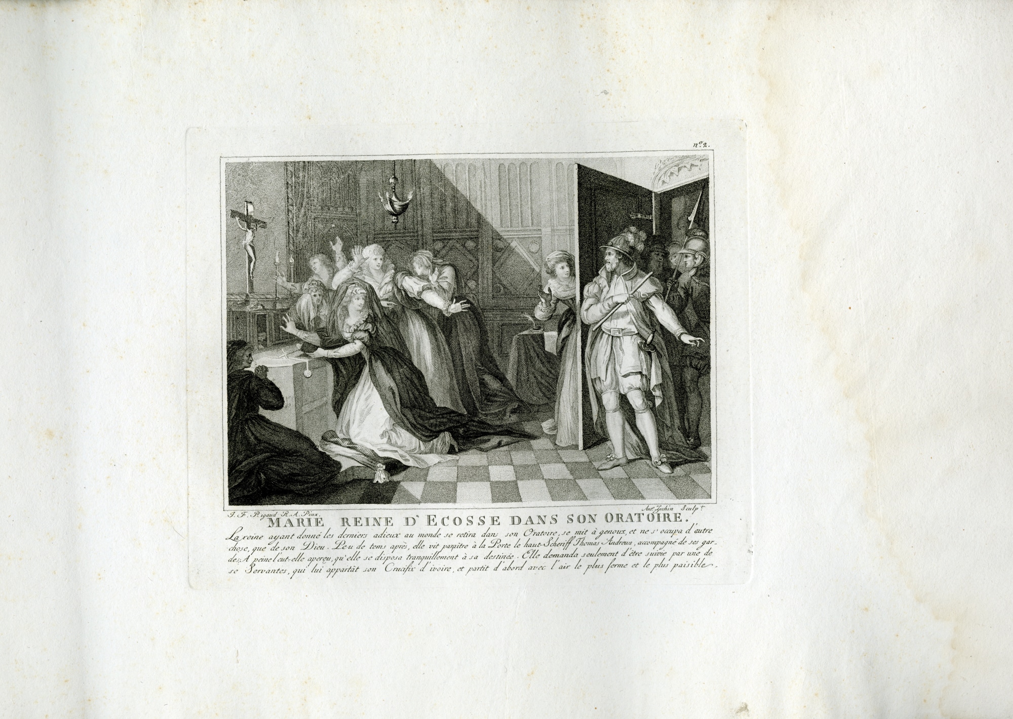 French: La reine ayant donné les derniers adieux au monde se retira dans son Oratoire, se mit à genoux, et ne s' occupa d'autre chose, que de son Dieu. Leu de tems apres, elle vit paraitre à la Porte le haut-Scheriff Thomas Andrews, accompagné de ses gar des; A peine l'cut-elle apereu, qu'elle se disposa tranquillement à sa destinée. Elle demanda seulement d' être suivie par une de se Servantes, qui lui appartât son Crucifix d' ivoire, et partit d'abord avec l'air le plus ferme et le plus paisible.