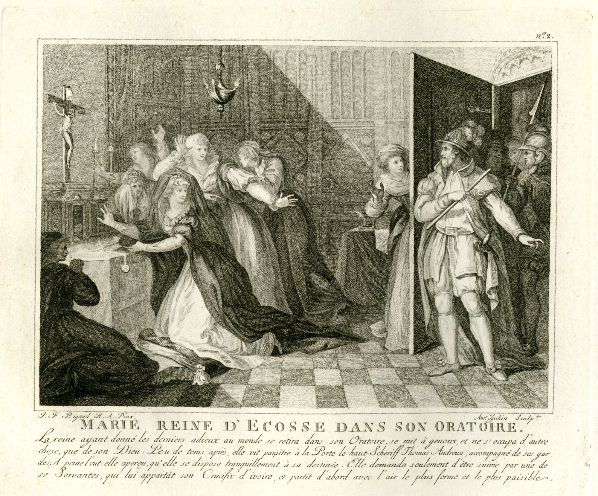 Item description: Mary Queen of Scots kneeling on the left at prayer in her chapel, is summoned to the scaffold by Thomas Andrews, High Sheriff who enters the room behind her to right with armed men, while the queen's ladies gesture with shock and dismay.