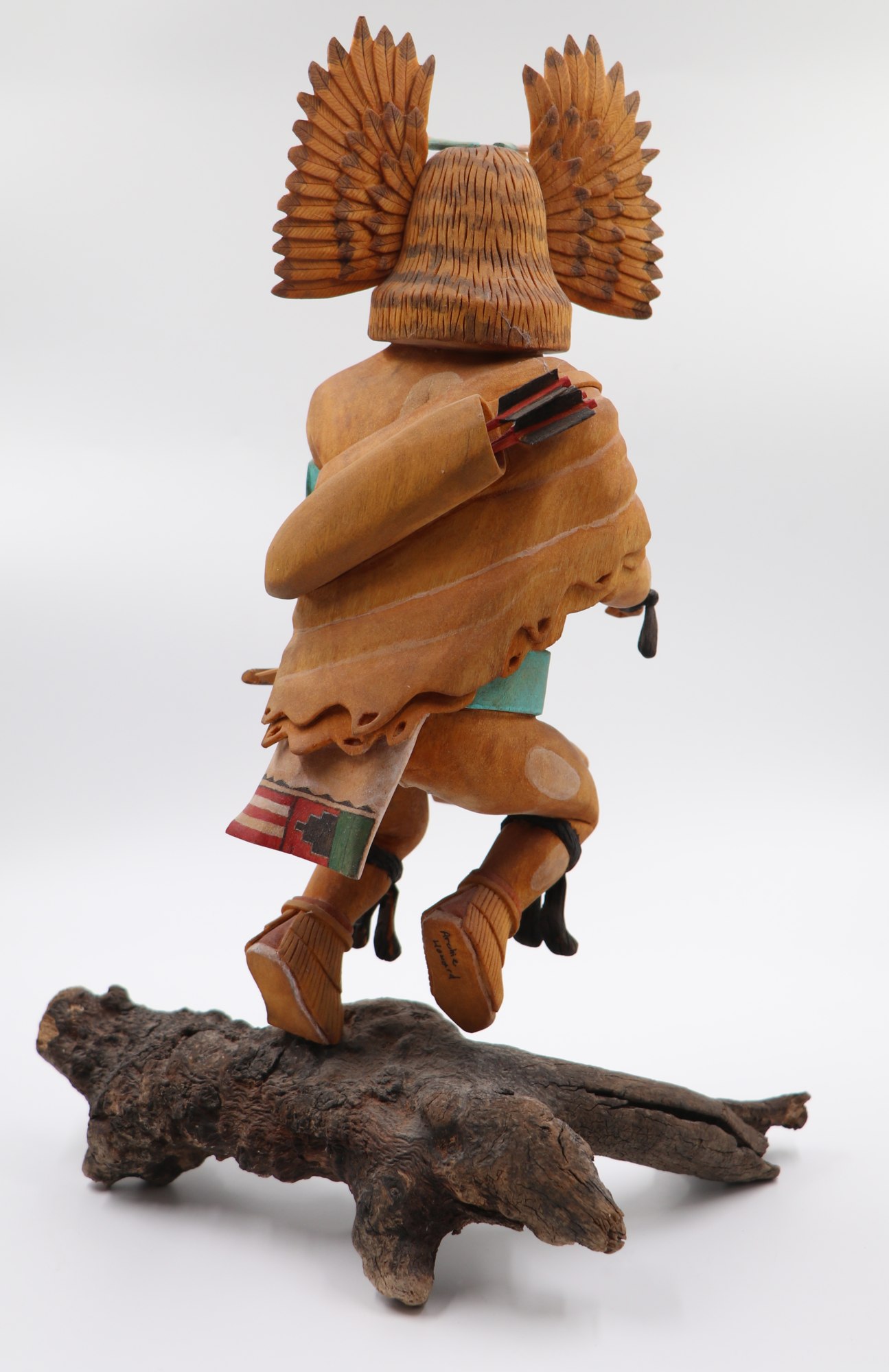 Item description: The Great Horned Owl Kachina, as a warrior, is relentless in persecuting the clowns. He stands at the edge of the dance circle while the clowns are performing, and he watches disapprovingly of their antics as they perform their un-Hopi-behavior. Near the end of the dance, a group of Mongwa swoop down on the clowns and beat them with yucca whips, douse them with water, and leave them piled up in the center of the plaza in pain.
