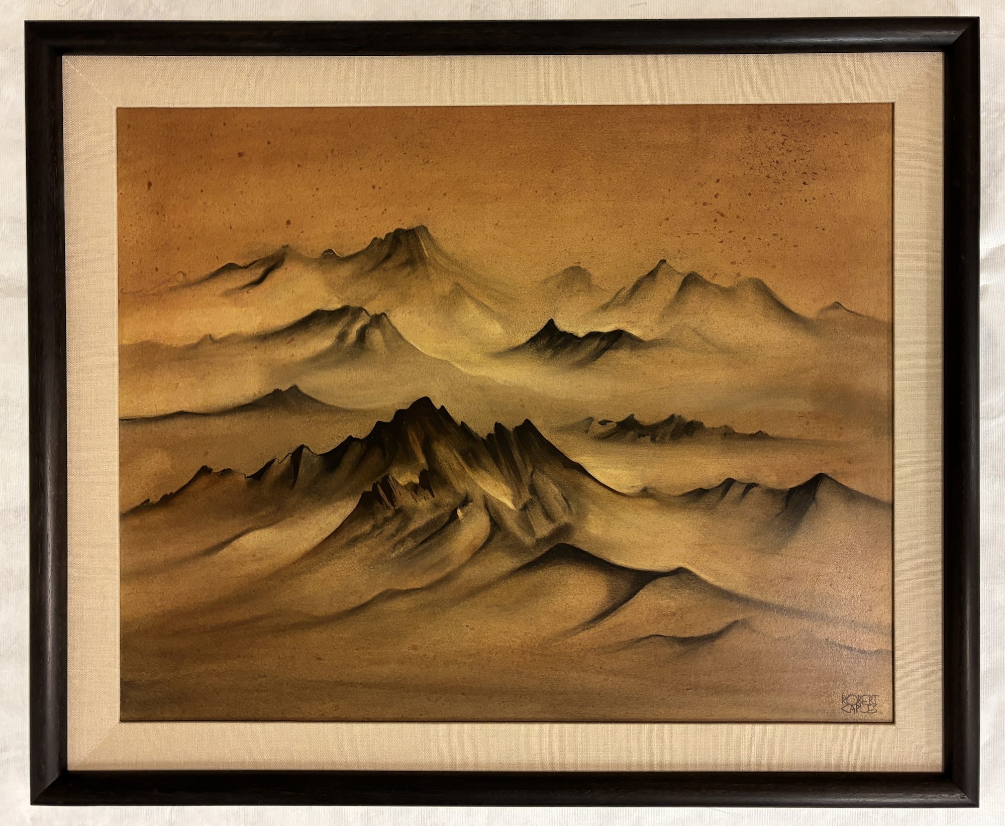 Item description: Painting of mountains with sepia background.