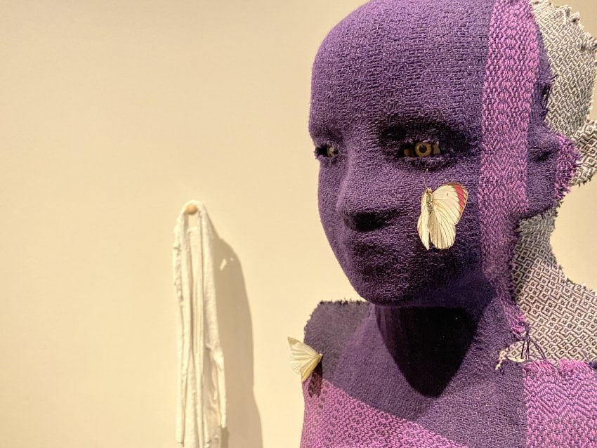 Purple cloth boy sculpture on wooden stand. Artwork from David R. Harper: My Own Personal Ghost installation.