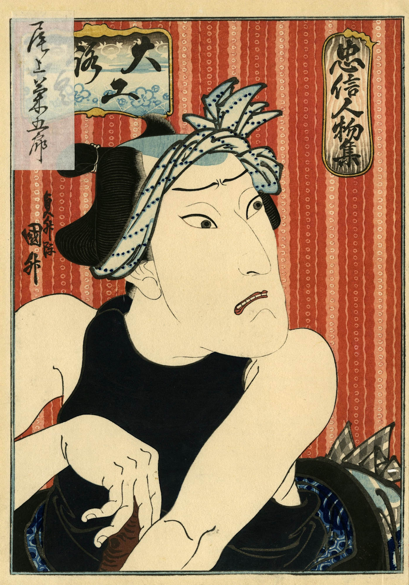 Item description: Portrait of an actor in all black dress wear with arms exposed and a blue headband. Red wallpaper/Background and writing in both the upper left and right corners.「忠信人物集」「大工ろくさ」