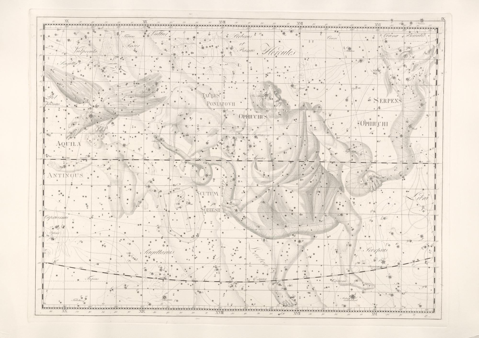 Black and white engraving print of star chart featuring Ophiuchus.