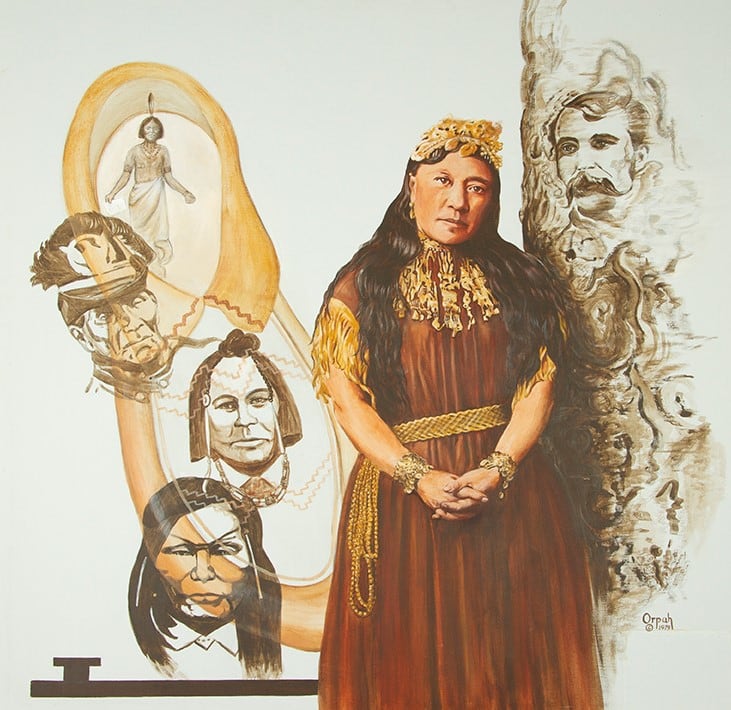 Item description: This painting is depicting some of the outstanding Paiute Indians who lived in Nevada and who tried to alleviate the injustices and cruelties that were dealt them. Sarah Winnemucca traveled extensively to lecture on the conditions of the Indians. Her grandfather, Chief Truckee Winnemucca, her father, Old Chief Winnemucca, her brother, Natchez Winnemucca and Na-Ma-Ga, Young Chief Winnemucca, were leaders of the Paiutes and are portrayed in the painting with a moccasin as the background. The name Winnemucca means "one moccasin". Sarah's husband and constant companion, H. Hopkins, is pictured in the tree. The peace pipe is significant in the portrayal of the composition.