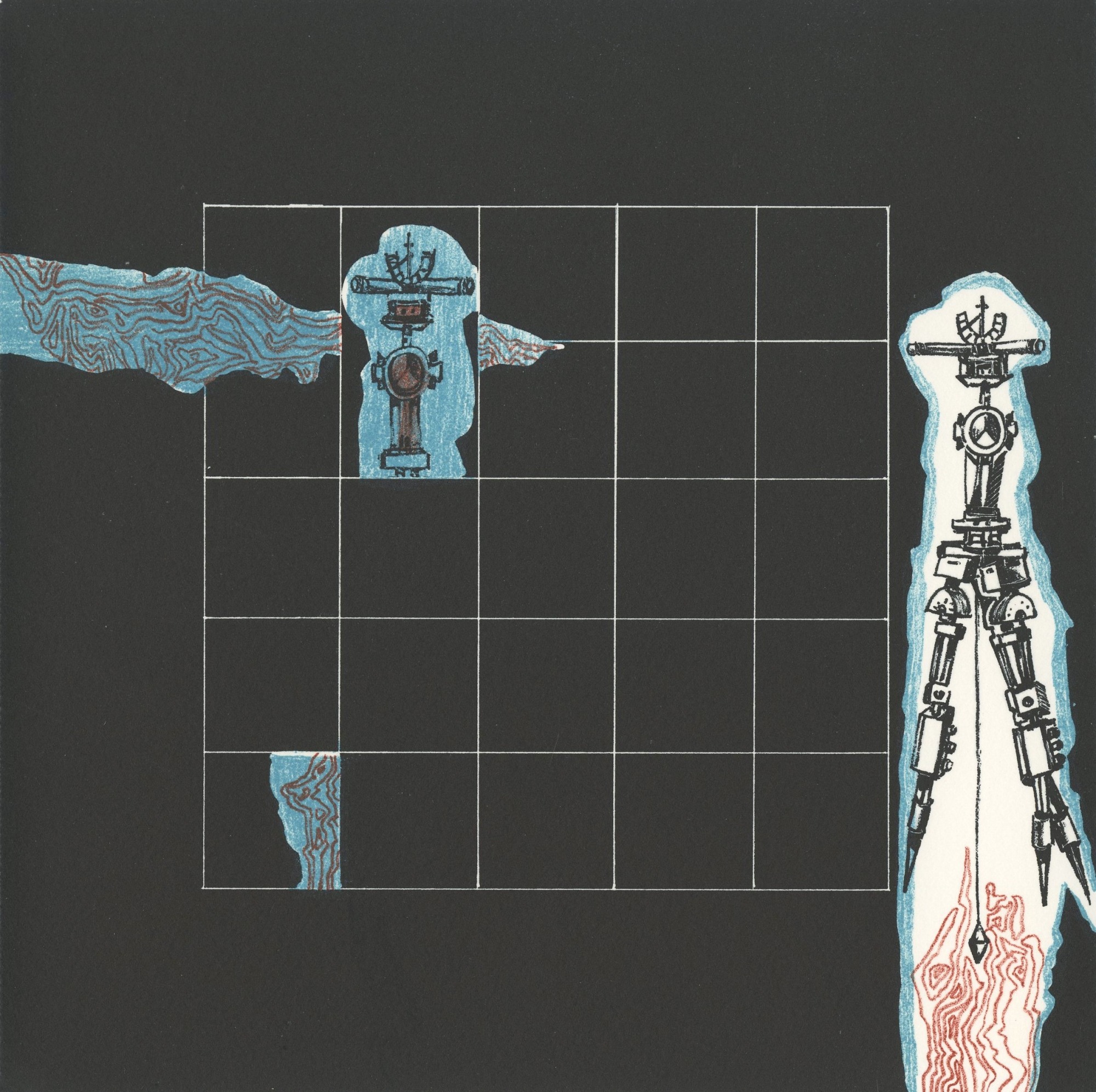 Black background, tri-pod on right, white grid lines in center with mechanism in blue area of grid.