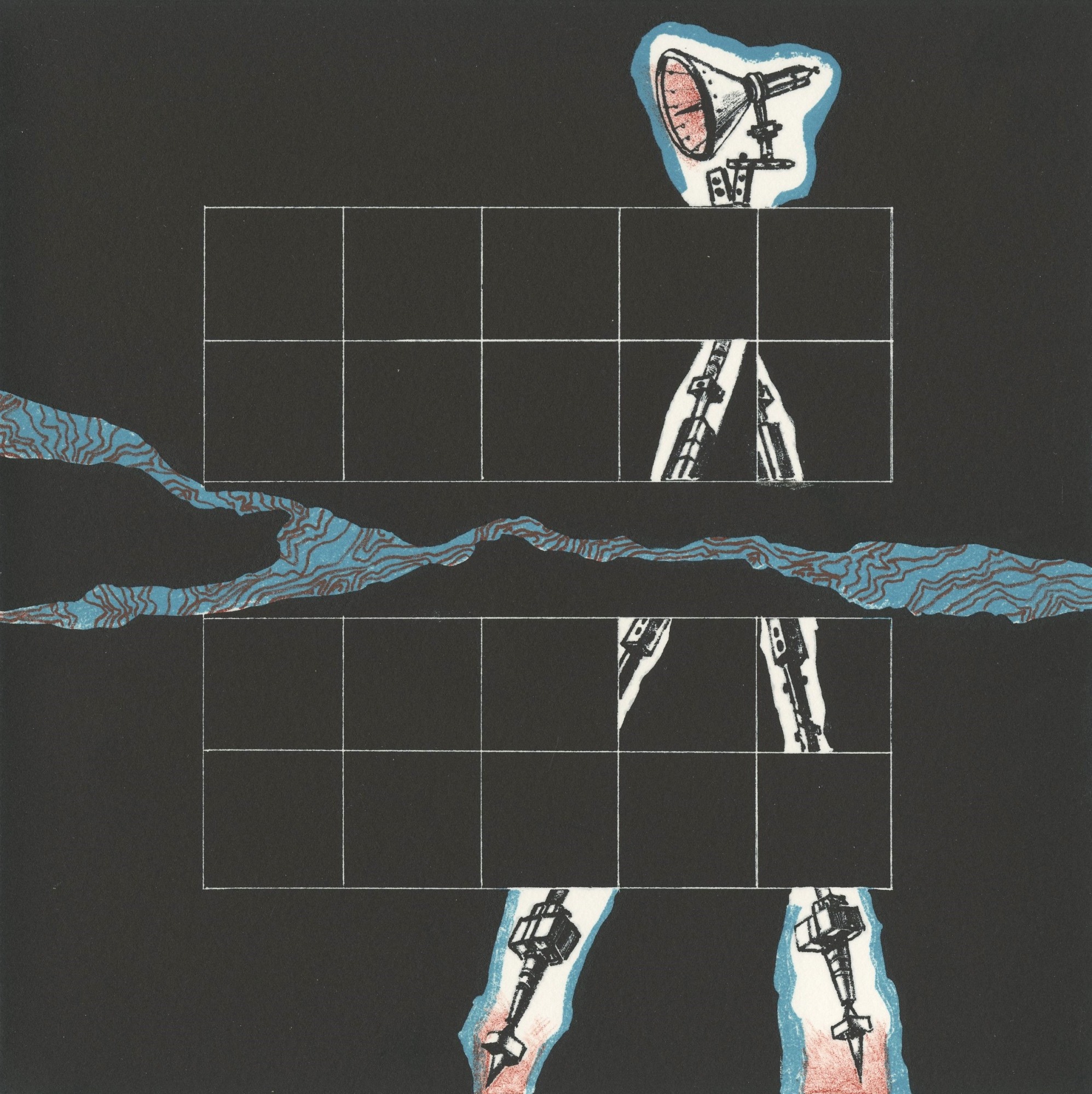 Tri-pod light inside grid lines with black background and blue streak horizontal through middle.