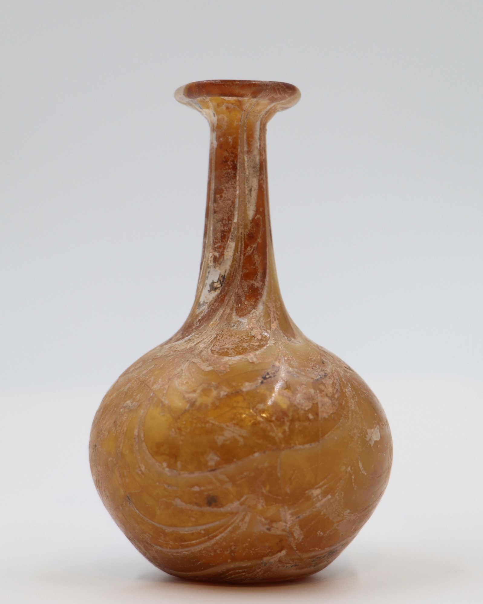 Roman unguentarium of amber-yellow glass with opaque milk-white trailing that has been marveled flush with the vessel's surface. The vessel's body is spherical with a slightly concave flattered base without a pontil mark, a tubular neck tapering towards the top, and a rim that folds outwardand has been rounded and thickened at the edge. From the base to the rim runs a white spiral trail that makes multiple revolutions and has been dragged up and down six or seven times to create a festoon pattern. The vessel has been expertly reassembled from a few large fragments; very stable and otherwise intact.