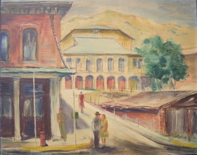 Item description: Corner of a street with three buildings and figures walking along the street.