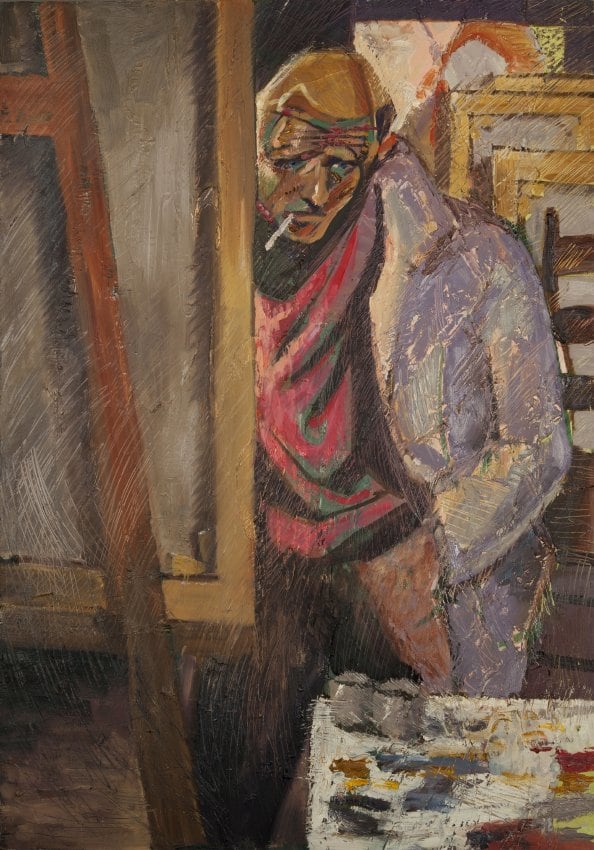 Item description: Self-portrait of artist painting and smoking in the studio.