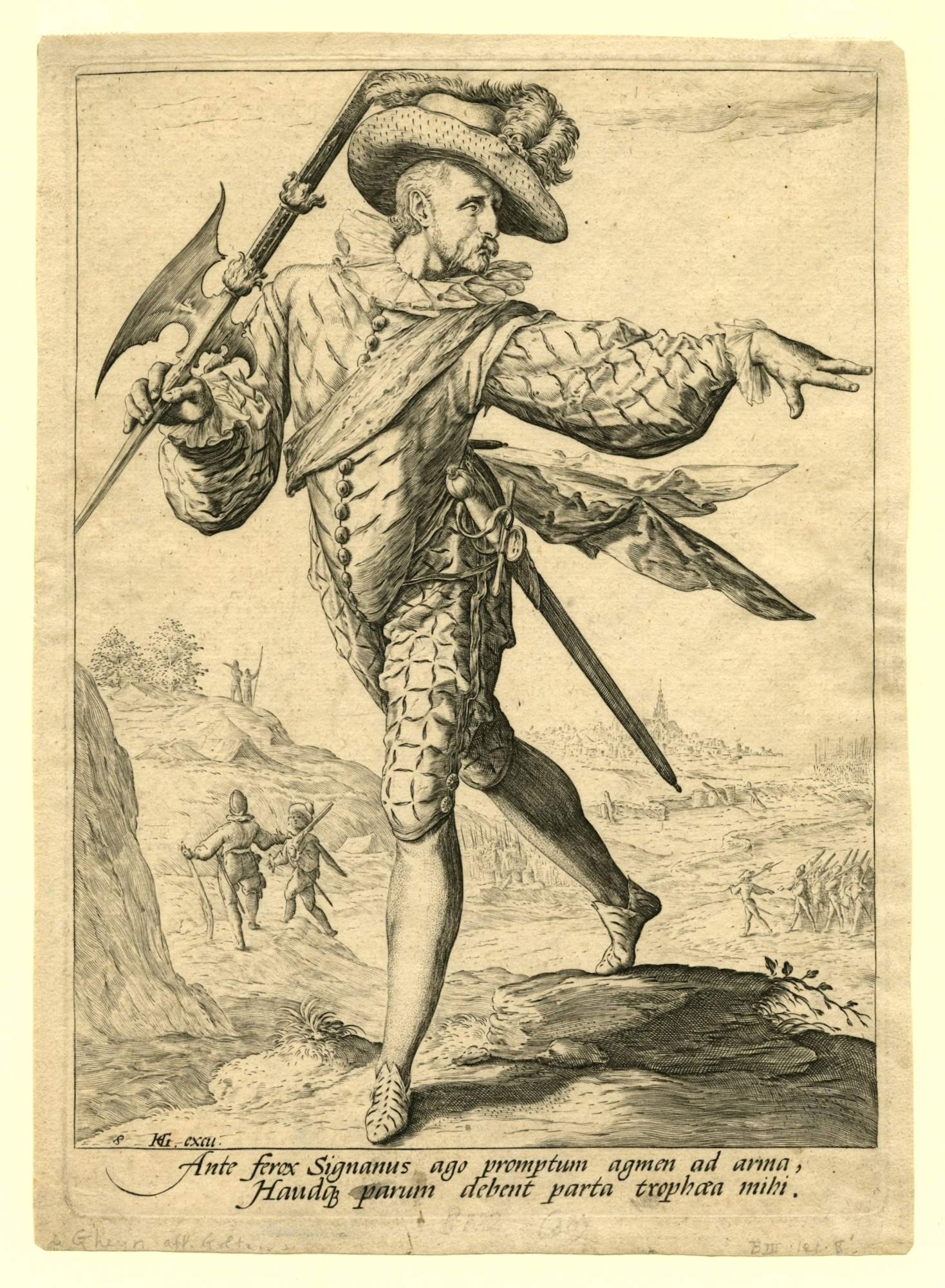 In 1587, Goltzius published the series of 12 prints entitled “Soldiers and Officers of the Bodyguard of Emperor Rudolph II”. Jacques de Gheyn II studied engraving under Goltzius. Emulating the technique of his master, De Gheyn design the engraving after Goltzius.