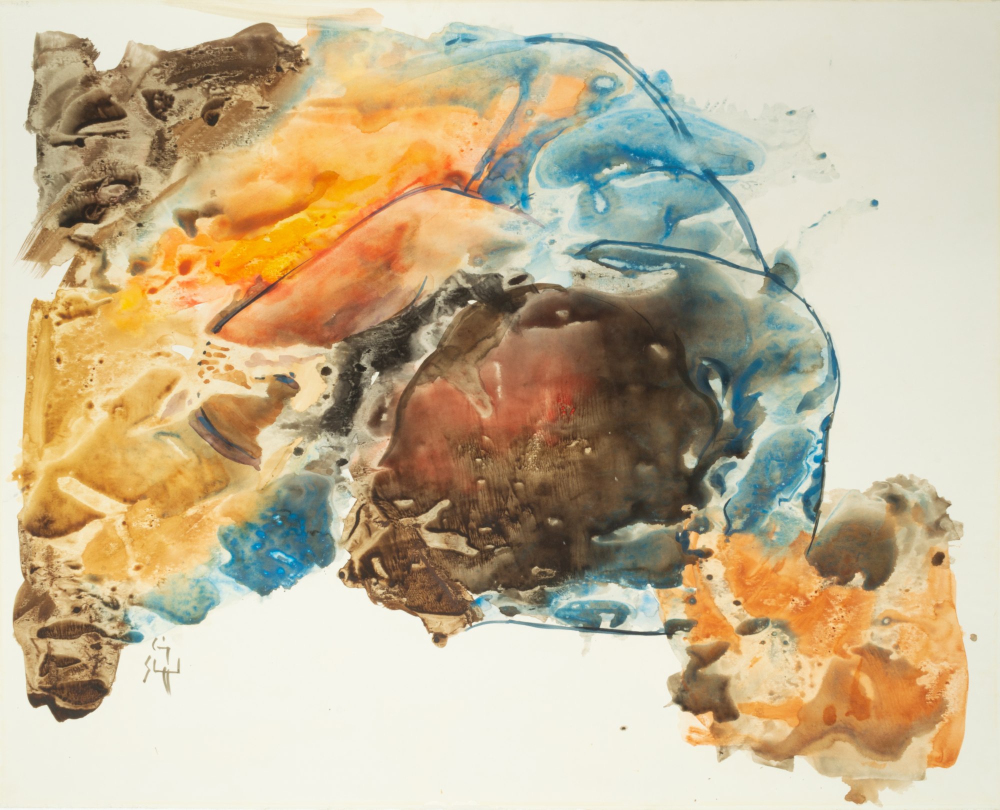 Item description: Loose watercolor abstraction of a person lying on their stomach with their head buried in one arm in hues of blues, oranges and browns.