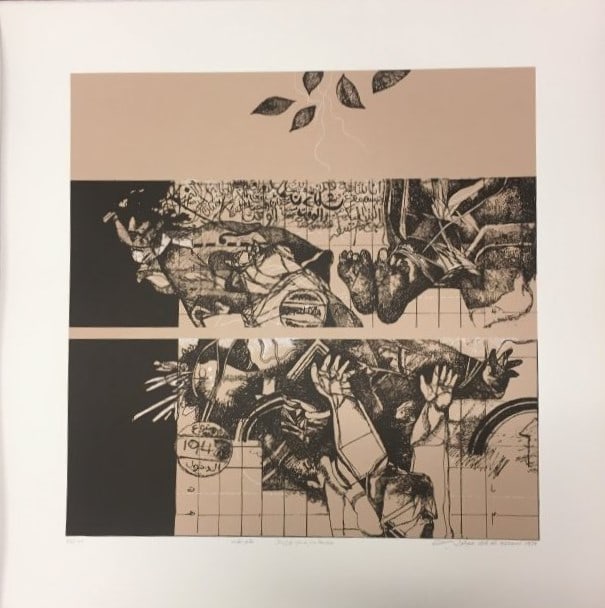 Feet and hands on top of a grid. Lettering next to hands. Falling leaves at top of print. Tan and dark brown color scheme.