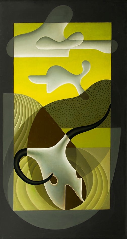 Item description: A green and white desert landscape abstraction with a cow skull.