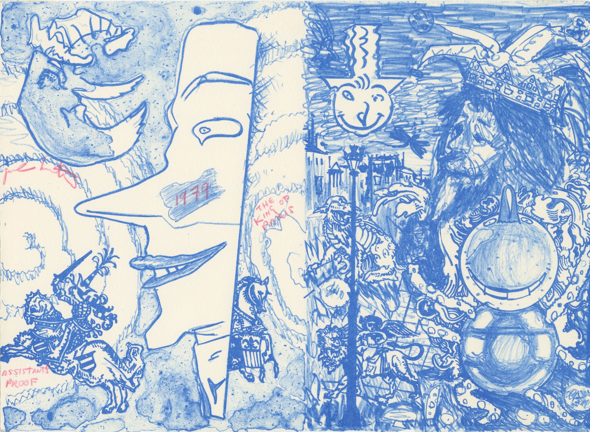 Print with large face at left with a crescent moon above, at uppler left corner, with knights, smily faces, and a bearded king at right--all printed in blue with some red.