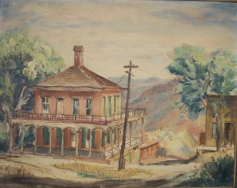 Item description: Image of a house with a telephone pole in front of it, surrounded by foliage, and a dirt road that leads to other buildings on the right and background.