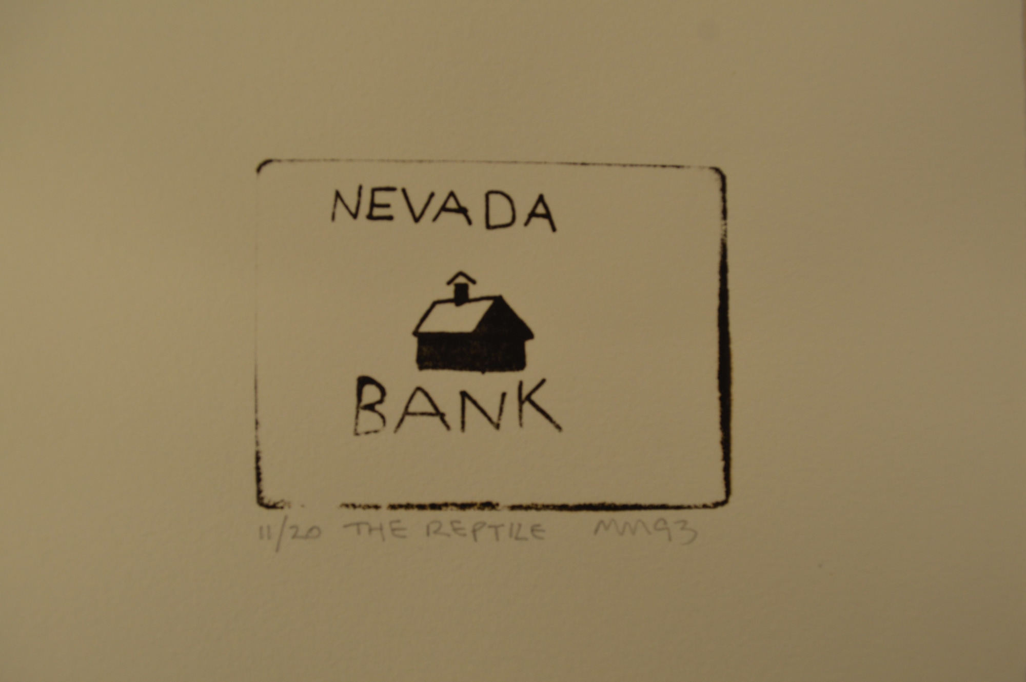 A small, minimalistic building is in the center of the frame, blacked out sans the roof. The word "NEVADA" is written above the structure, and the word "BANK" is written below it.
