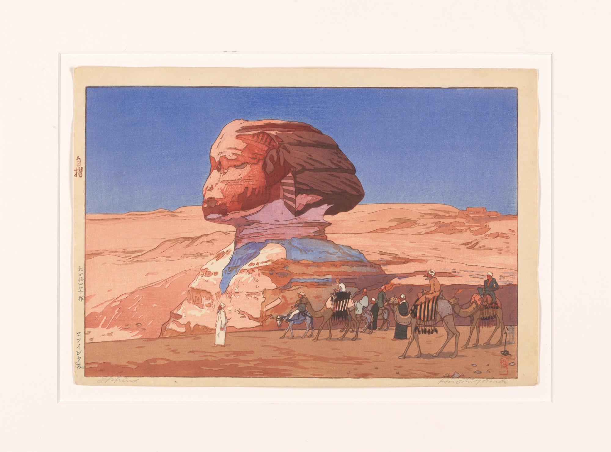 Item description: A profile view of the Sphinx during the day, with figures, some on camels, in the foreground.