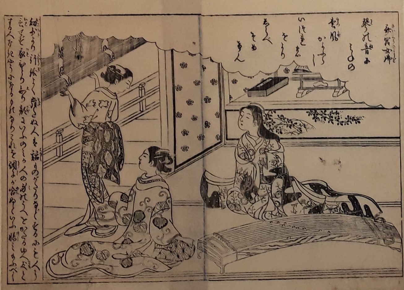 Three Graceful Figures of Girls - One created beside the Koto. Double pannel, black ink. Japanese
