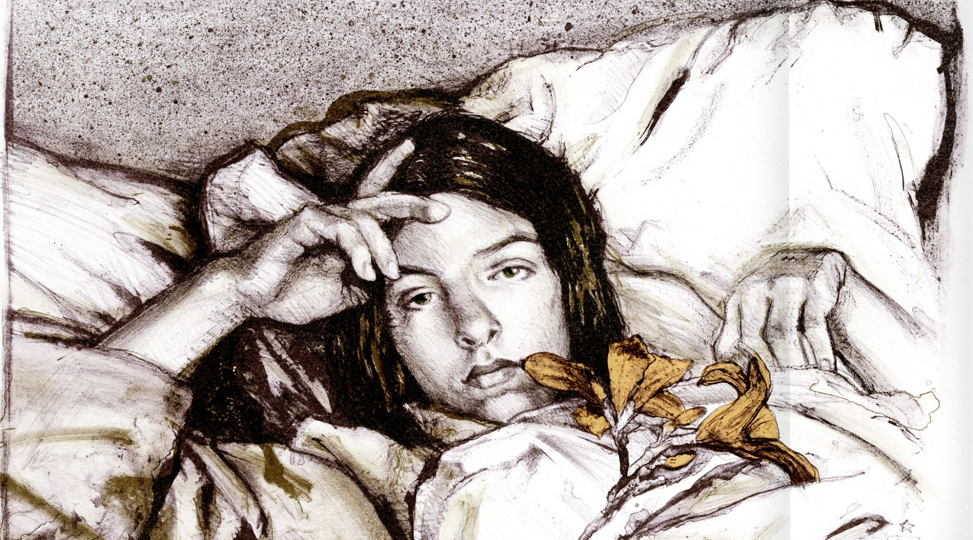 Item description: Portrait of woman lying in bed with a tiger lily in her hand. Lithographed in purple-gray, dark brown, orange and green on Rives BFK Gray.
