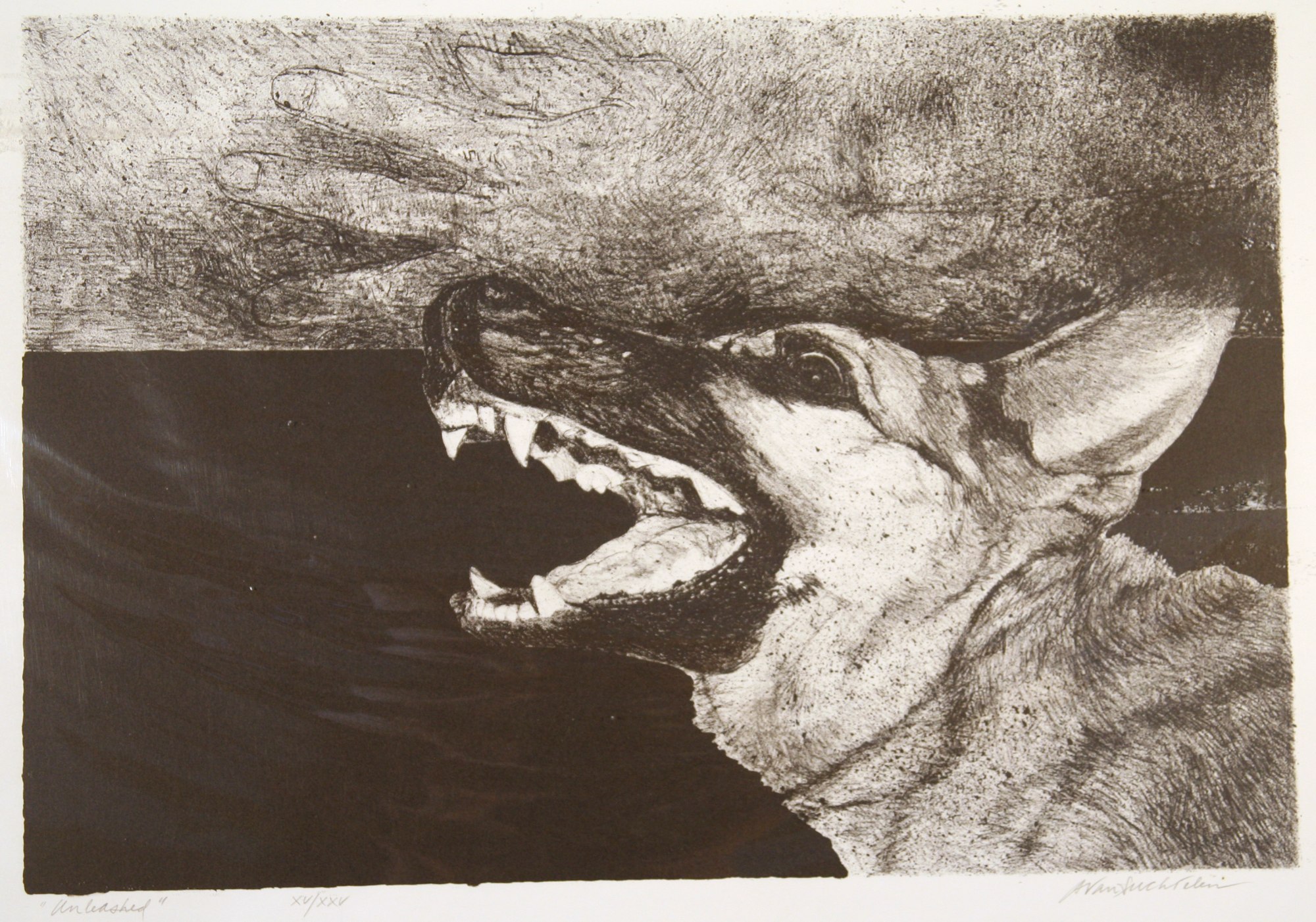 Item description: Side portrait of a dog, mouth open, looking upward. Mostly black background, grey top register has sketch of human hand.