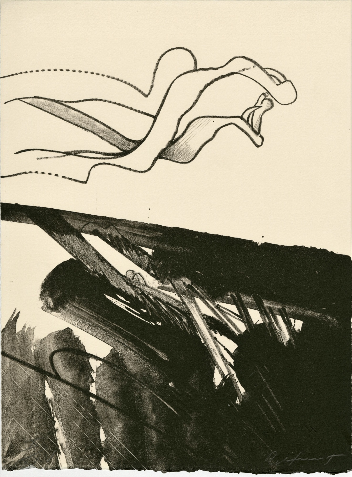Item description: Black and white abstraction. Upper register has figures formed by black lines. Lower register is mostly back with white beams throughout.