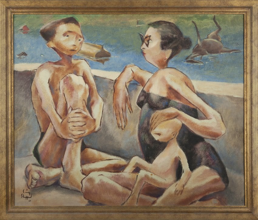Item description: Man, woman, and child in boat in front of dead, floating horse and capsized boat.