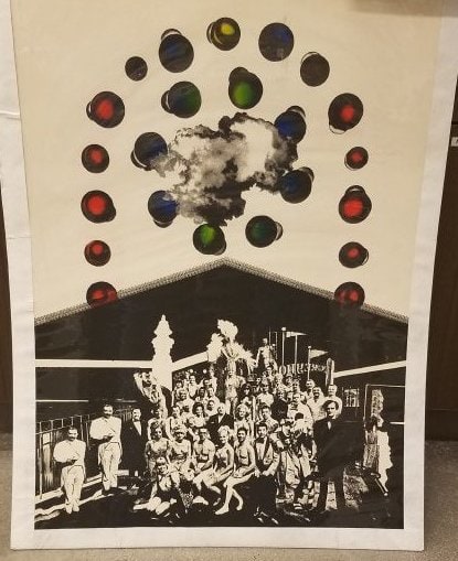 Item description: A group portrait on the bottom, looks like an entertainment group. On the top of the picture there's red and green Christmas balls.
