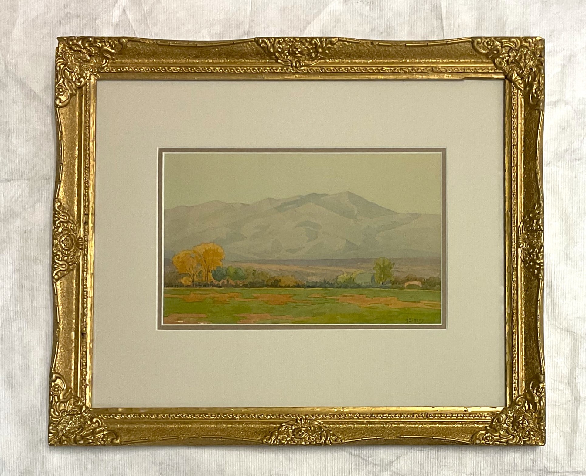 Item description: A Reno landscape watercolor of a valley with mountains, and some yellow trees on the left.