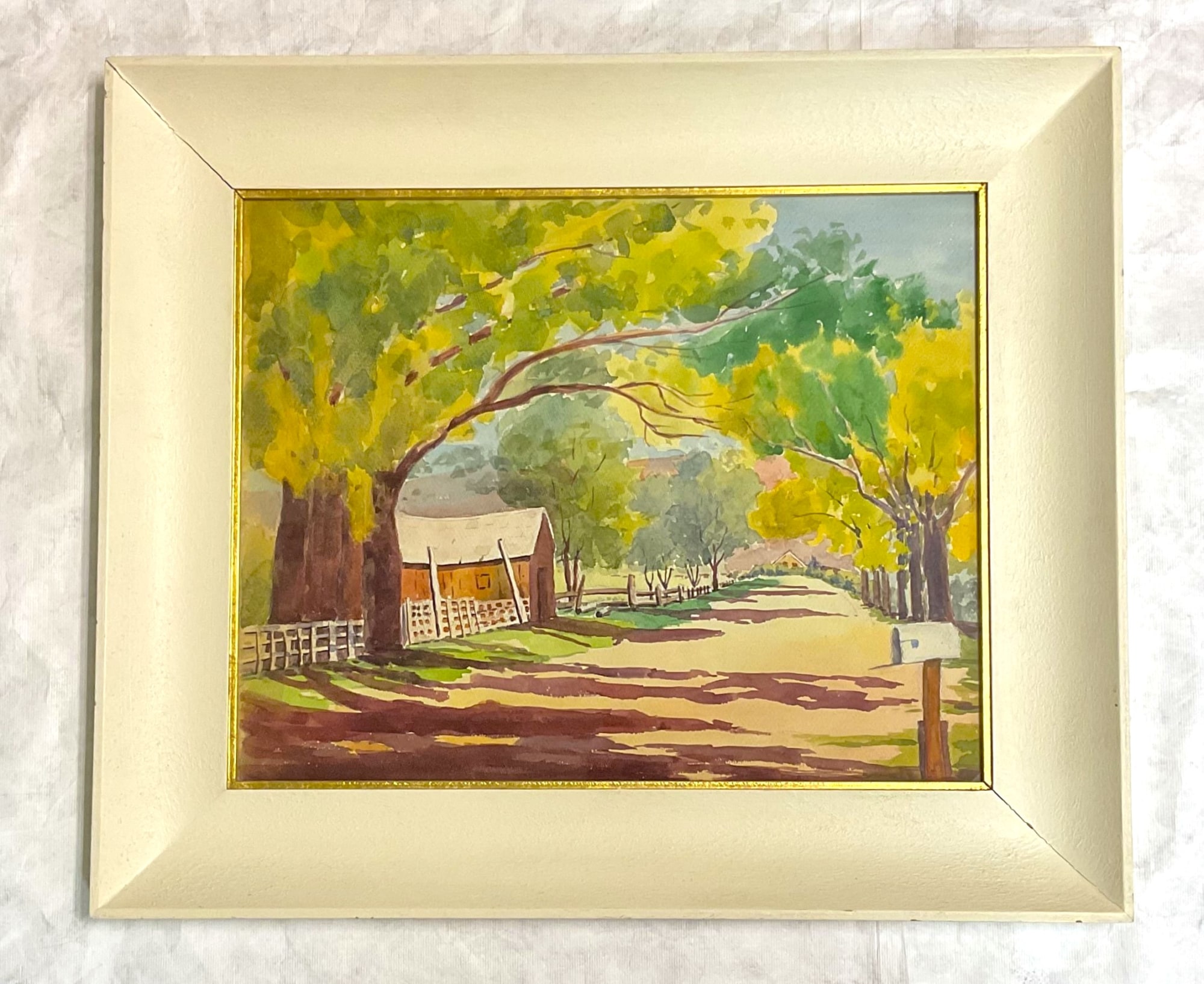 Item description: Landscape of trees, road, building, and mailbox in lower right corner.