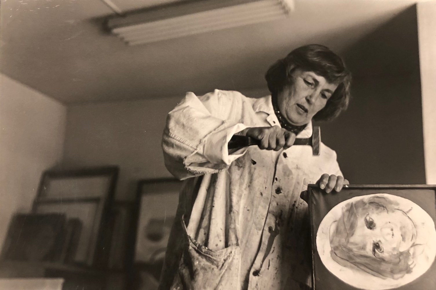 Item description: Lucy Nieder doing work on a painting in their studio.