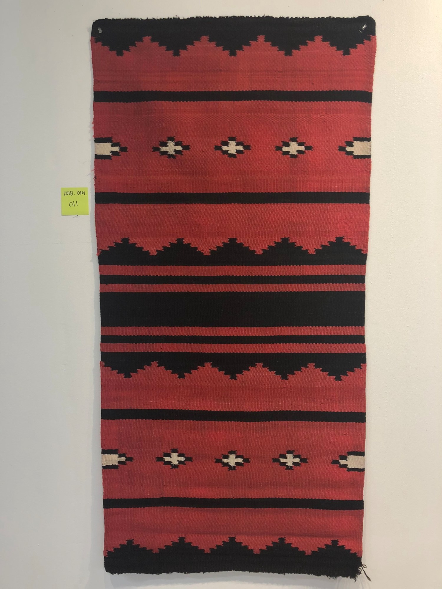 Black, Red, and White colored rug with stripes and triangular and diamond shapes.