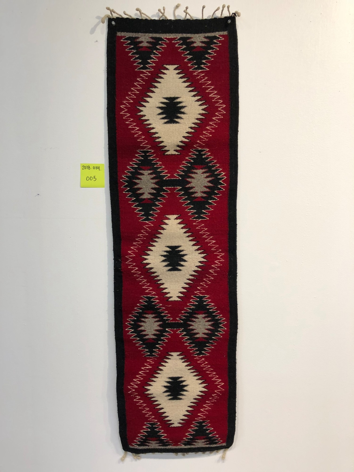 Black, Red, Grey, and Beige rugs with diamond pattern and fringe on the shorter ends.